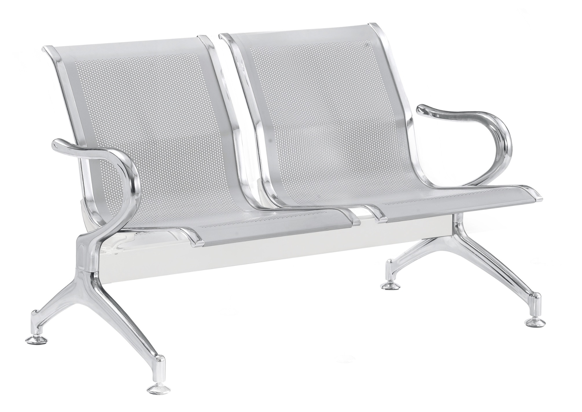 Banca de 2 Plazas con Asiento y Respaldo Fabricados en Lámina de Acero Calibre 14″ Multiperforada, Brazos Laterales y Patas de Lámina Troquelado y Regatones de Cuerda para Altura Regulable.