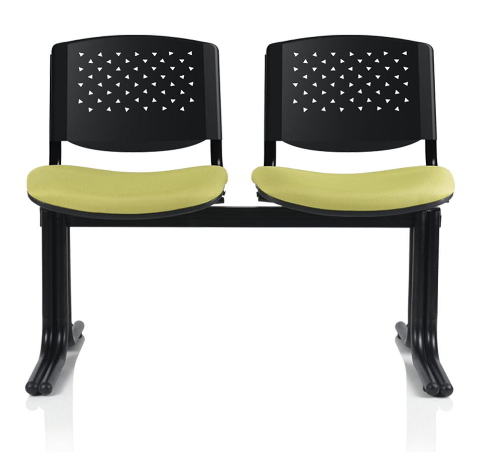 Banca de 2 Plazas con Respaldos de Polipropileno Negro Multiperforados con Figuras de Triángulos, Asientos Tapizados en Tela y Estructura de Acero Tubular y Rectangular Color Negro.