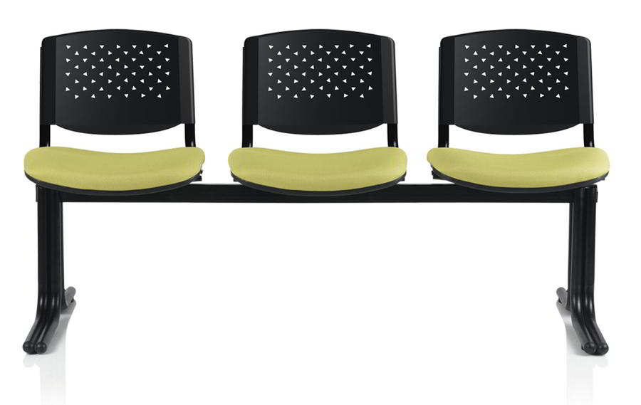 Banca de 3 Plazas con Respaldos de Polipropileno Negro Multiperforados con Figuras de Triángulos, Asientos Tapizados en Tela y Estructura de Acero Tubular y Rectangular Color Negro.