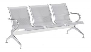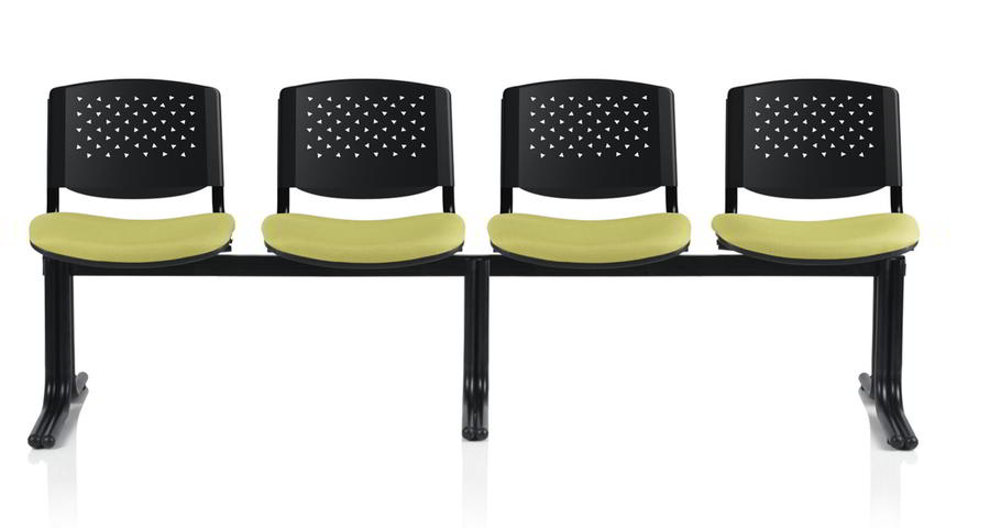 Banca de 4 Plazas con Respaldos de Polipropileno Negro Multiperforados con Figuras de Triángulos, Asientos Tapizados en Tela y Estructura de Acero Tubular y Rectangular Color Negro.