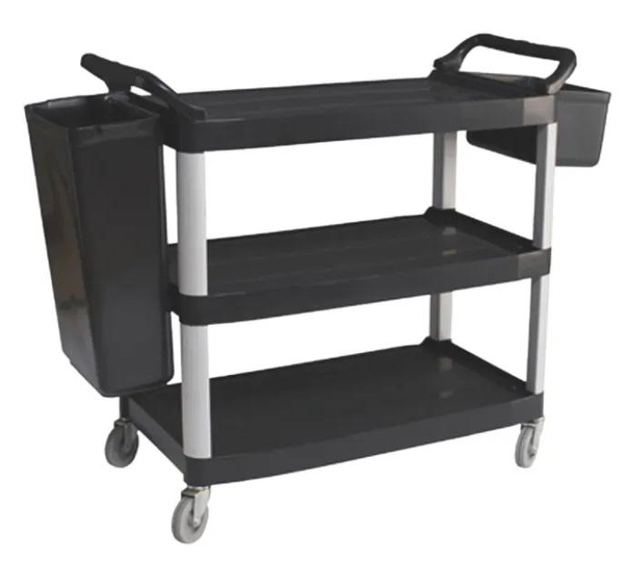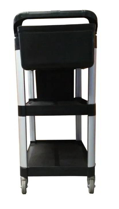 Carro de Tres Niveles con Contenedores y Charolas Fabricadas en Polipropileno y Postes de Aluminio. Contenedor Grande con Capacidad de 30 Litros y Contenedor Chico de 10 Litros. Entrepaños de 43 x 57 cm.