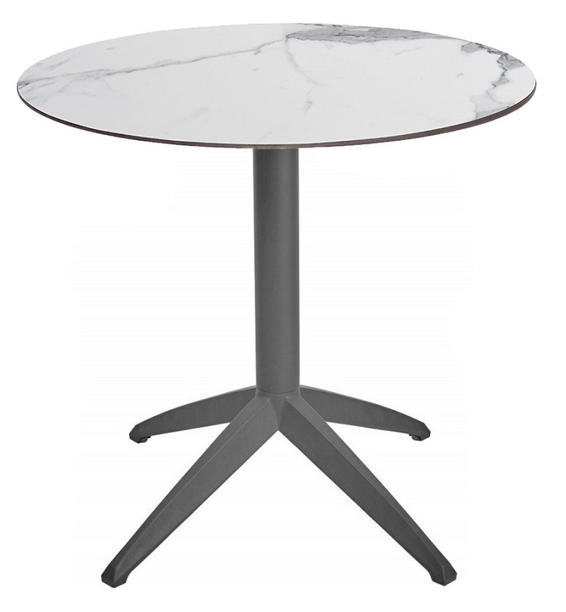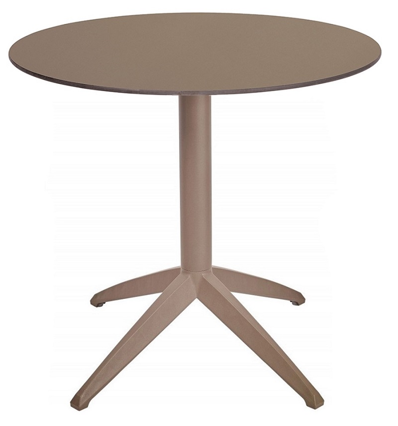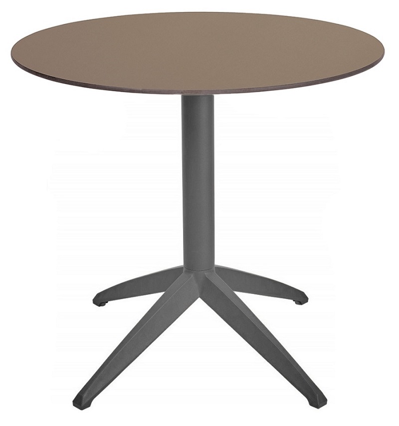 Mesa Quatro Fix con Cubierta Redonda en Tablero Compacto HPL, Patas de Polipropileno con Fibra de Vidrio e Inyección por Gas y Tubo de Aluminio Lacado.