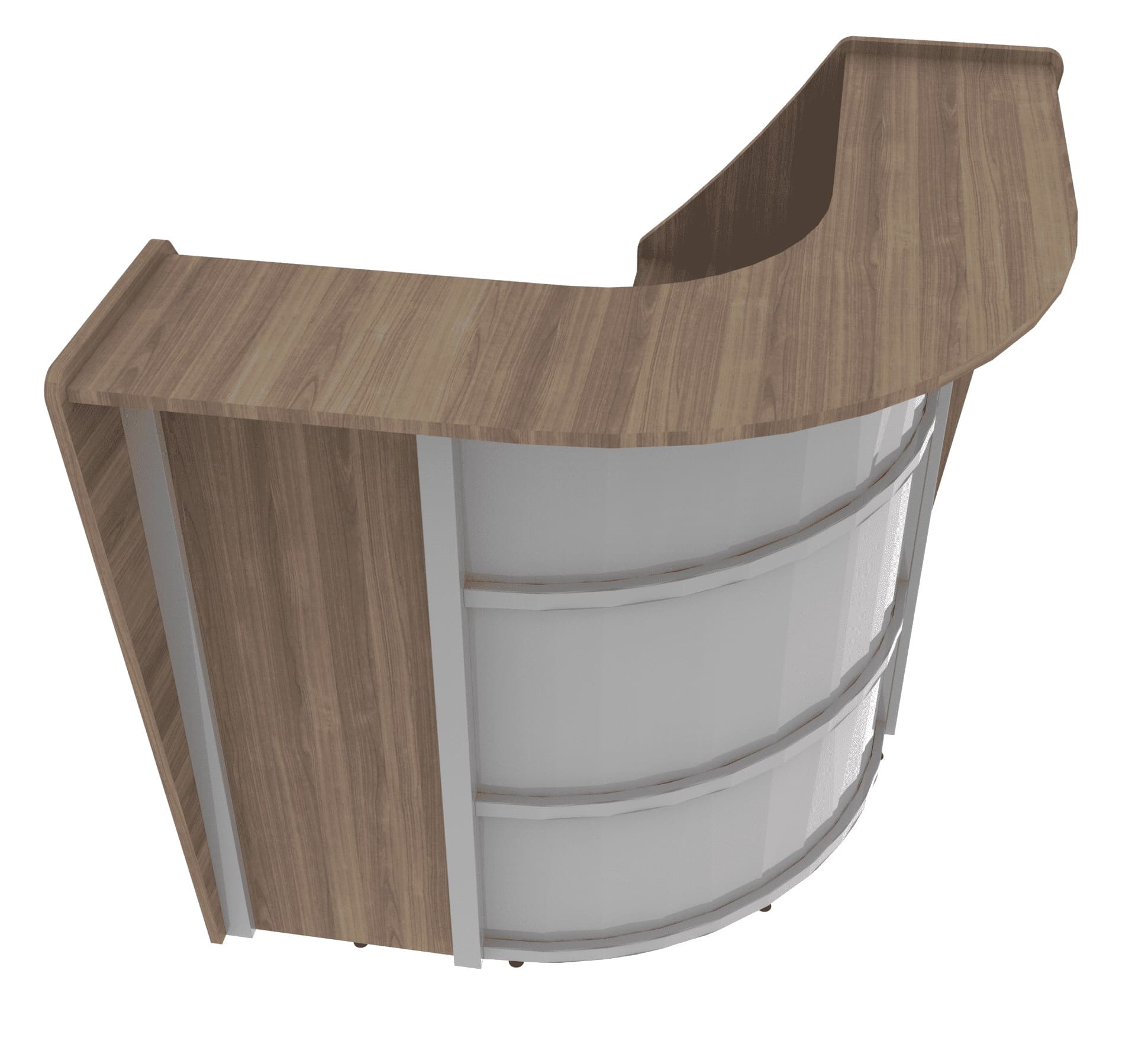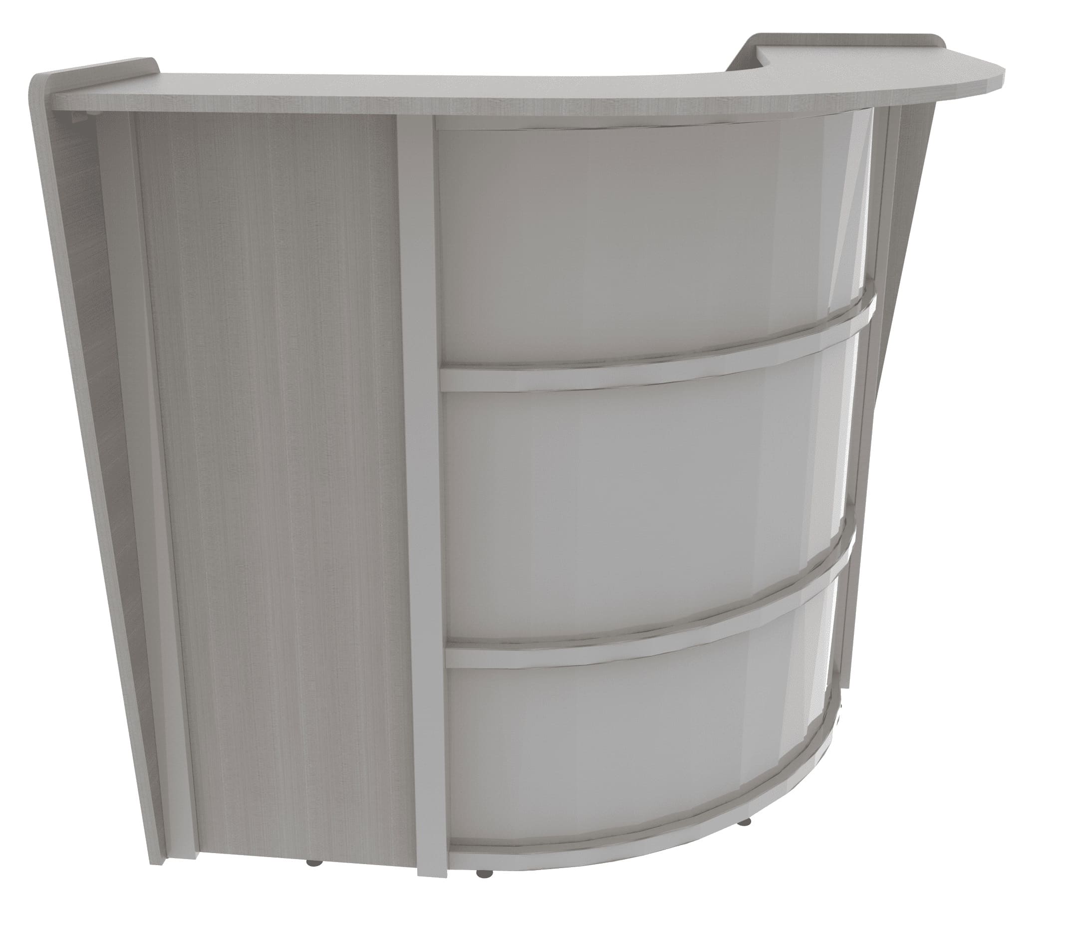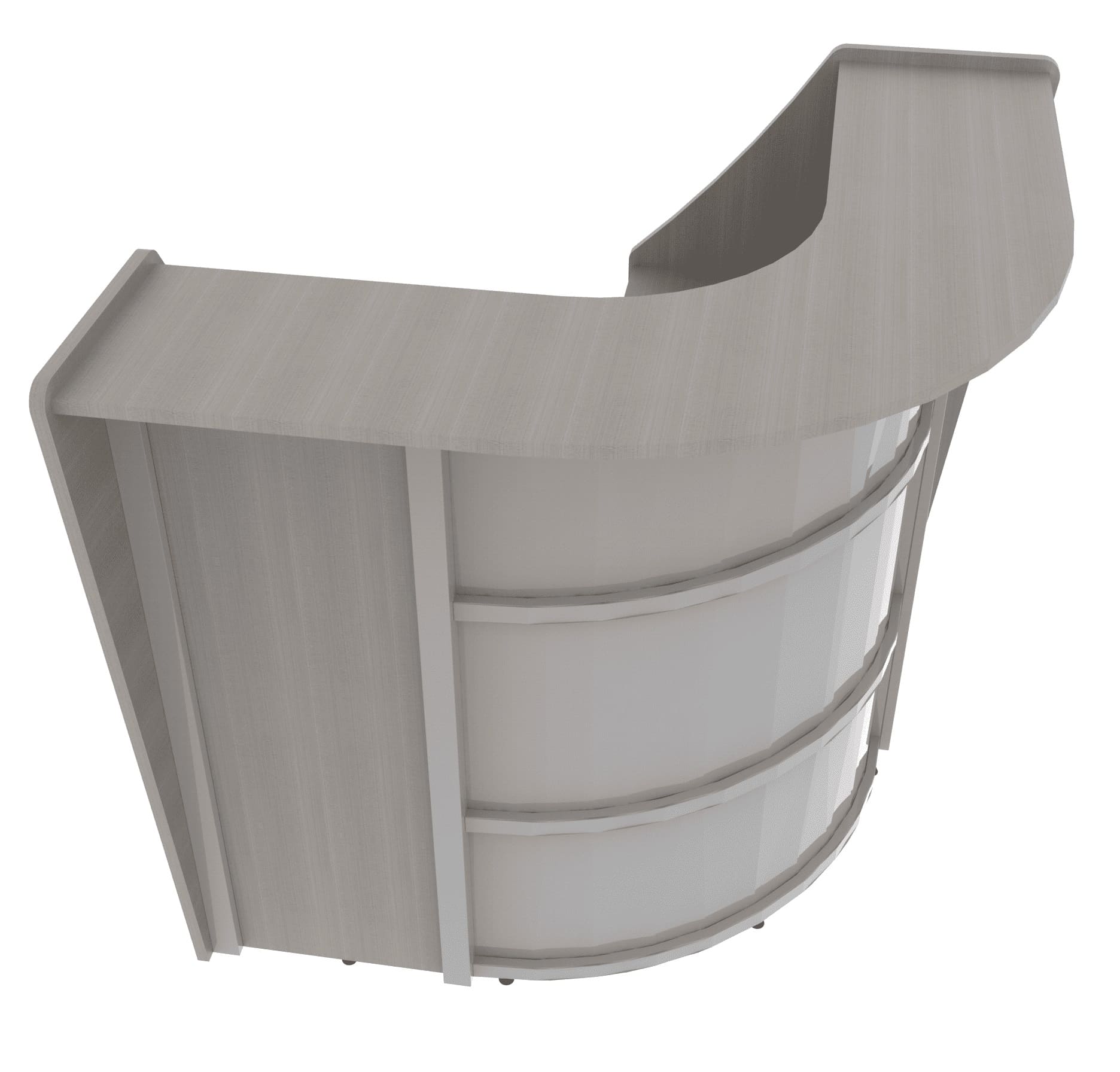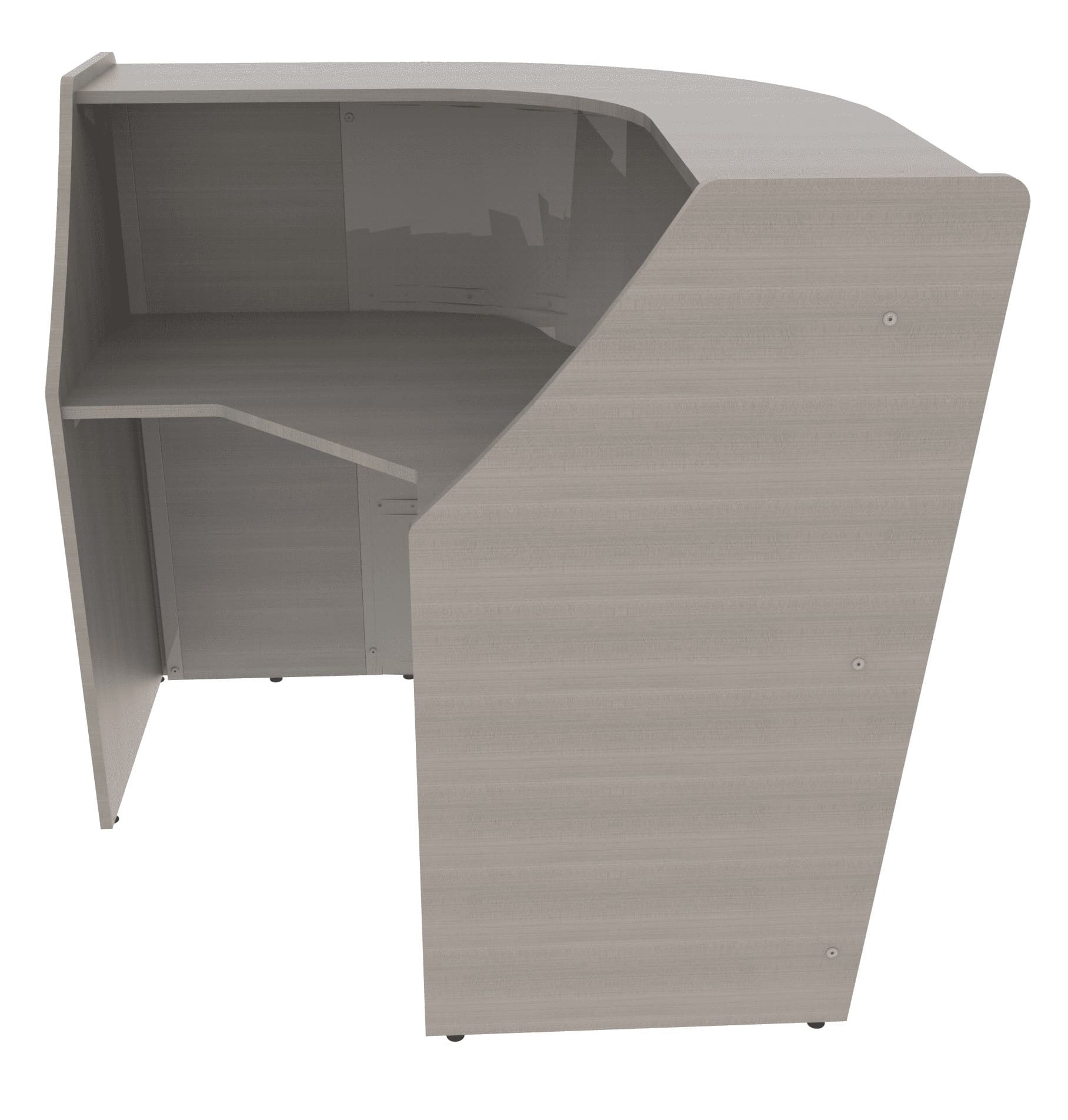Recepción Esquinera con Cuerpo Fabricado en Melamina de 19 mm de Espesor y Frentes de Policarbonato Gris con Regatones Niveladores.