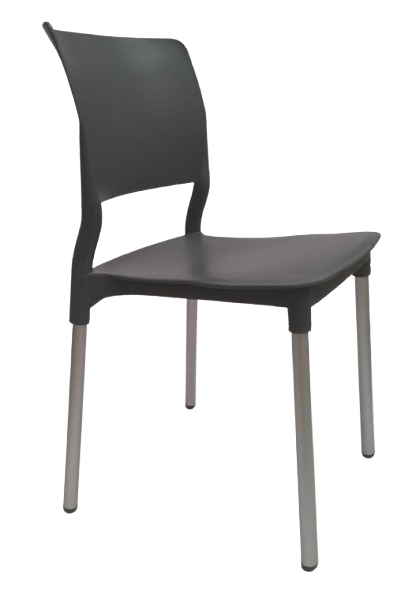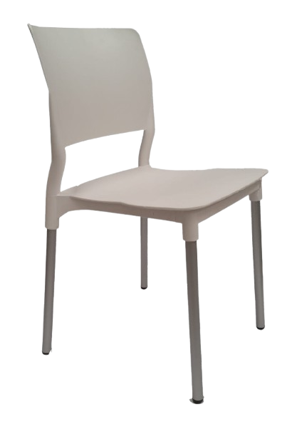 Silla de Polipropileno Inyectada en Una Sola Pieza con Patas de Tubo Redondo de Aluminio Anodizado Satinado. Apilable Hasta 10 Piezas. Utilizada para Interiores y Exteriores.