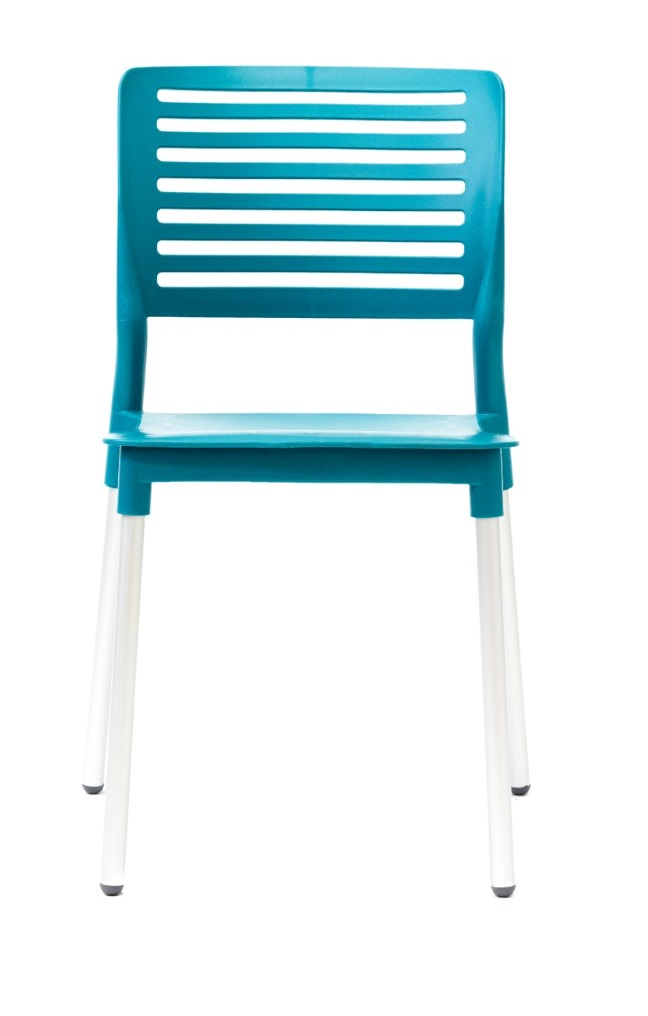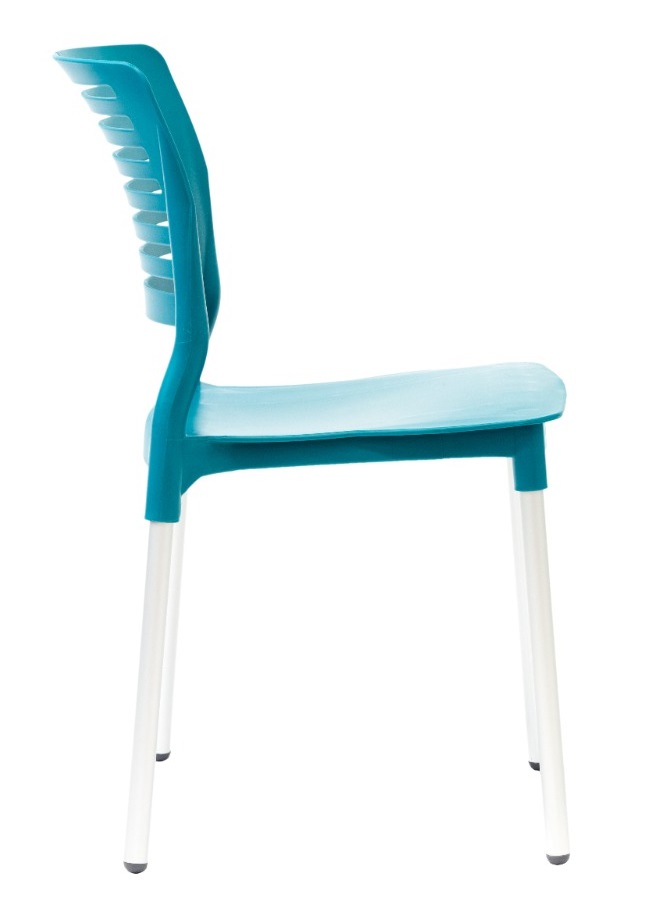Silla de Polipropileno Inyectada en Una Sola Pieza con Patas de Tubo Redondo de Aluminio Anodizado Satinado. Apilable Hasta 10 Piezas. Utilizada para Interiores y Exteriores.