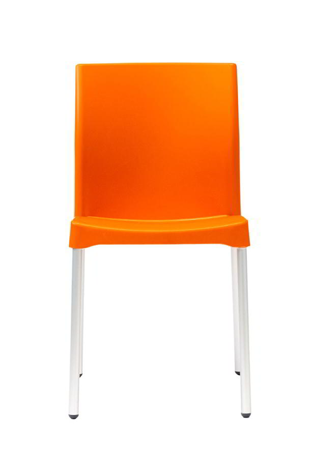 Silla de Polipropileno Inyectada en Una Sola Pieza con Patas de Tubo Redondo de Aluminio Anodizado Satinado. Apilable Hasta 10 Piezas. Utilizada para Interiores y Exteriores.