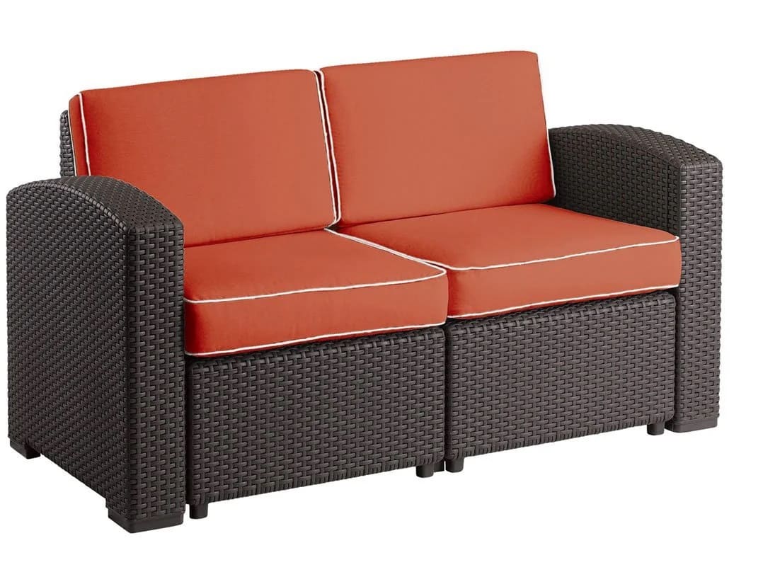 Sofá de Dos Plazas (Loveseat) con Asiento y Respaldo Compuesto por Cojines Tapizados en Tela y Estructura de Polipropileno Resistente a Rayos Ultravioleta (UV) con Terminado en Tejido Imitación Rattan para Uso en Interiores y Exteriores.