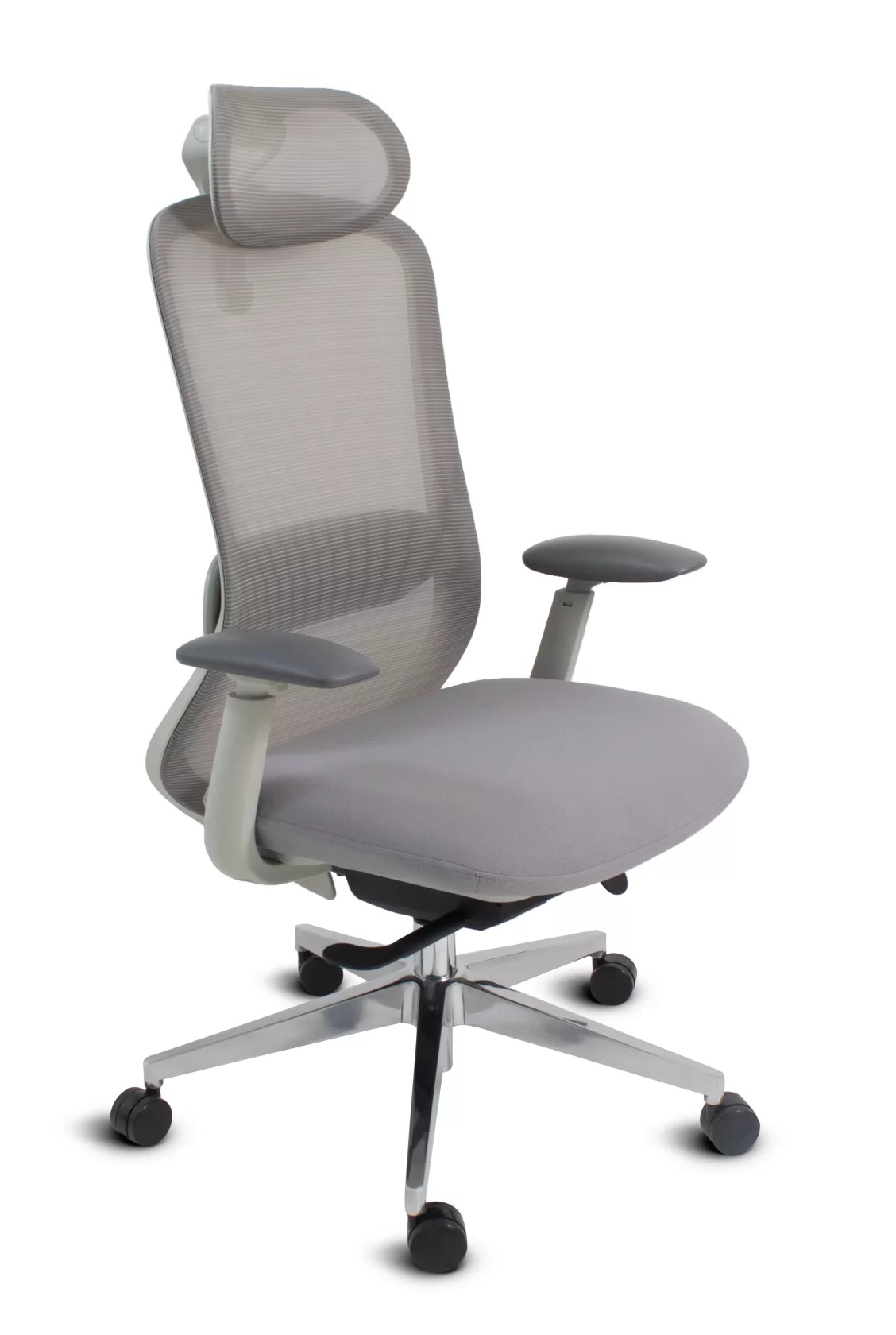 Silla Directiva con Cabecera Ajustable Tapizada en Malla, Respaldo Tapizado en Malla con Almohadilla Lumbar Ajustable, Asiento Tapizado en Tela con Espuma de Poliuretano Inyectado, Brazos con Codera en Poliuretano Suave con Ajuste de 4 Posiciones, Mecanismo Synchro de Dos Palancas para Ajuste de Altura y Ajuste de Reclinamiento, Slider para Deslizar el Asiento y Base de Aluminio de 27” con Rodajas.