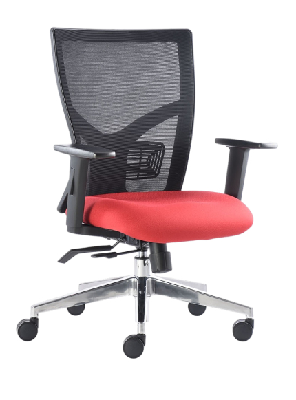 Silla Ejecutiva con Respaldo Alto Tapizado en Malla, Asiento de Poliuretano Inyectado Tapizado en Tela, Soporte Lumbar, Mecanismo Syncro Reclinable con Dos Palancas para Bloqueo en Cualquier Posición y para Ajuste de Profundidad del Asiento en 4 Posiciones, Brazos Ajustables de Gel con Poliuretano y Base de Aluminio con Rodajas.