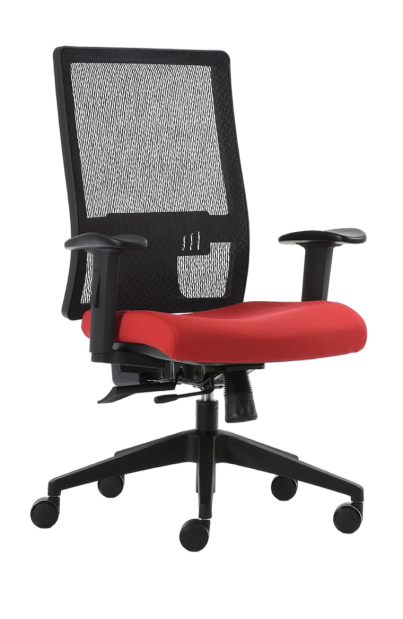 Silla Ejecutiva con Respaldo Alto Tapizado en Malla, Asiento de Poliuretano Inyectado Tapizado en Tela, Brazos Ajustable con Pad en Poliuretano Suave, Mecanismo Syncro con Dos Palancas para Slide en Ajuste de Profundidad con 4 Posiciones, Antishock y Base de Nylon con Rodajas.