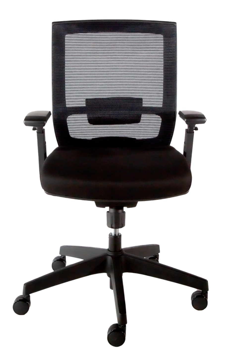 Silla Ejecutiva con Respaldo en Malla, Asiento con Espuma de Poliuretano Inyectado Tapizado en Tela, Almohadilla Lumbar Ajustable de Altura, Mecanismo con Una Palanca para Ajuste de Altura, Ajuste de Reclinamiento y para Deslizar el Asiento, Perilla Tensora de Reclinamiento, Brazos Ajustables con Codera en Poliuretano Suave y Base de Nylon de 27” con Rodajas.