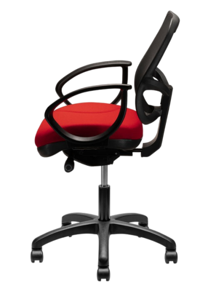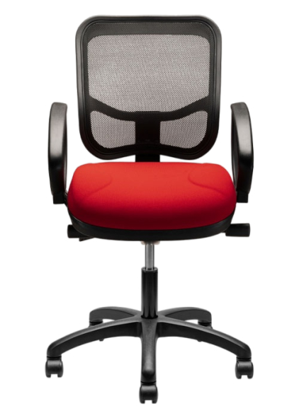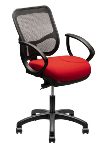 Silla Giratoria con Respaldo Bajo Tapizado en Malla Negra, Asiento Tapizado y Acojinado con Espuma de Poliuretano, Coderas Fijas o Ajustables, Pistón Neumático para Ajuste de Altura, Mecanismo de Reclinación Knee Tilt (Rodilla) en Respaldo, Ajuste de Tensión de Reclinación por Perilla, Palanca para Ajuste de Altura en Asiento y Base de 5 Brazos de Poliamida Reforzada con Rodajas o Regatones.