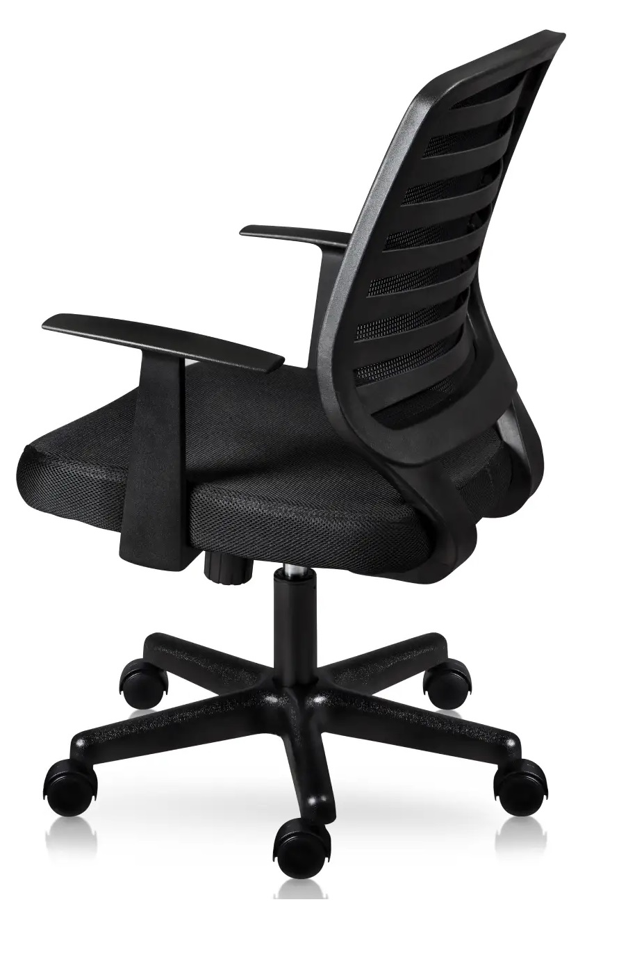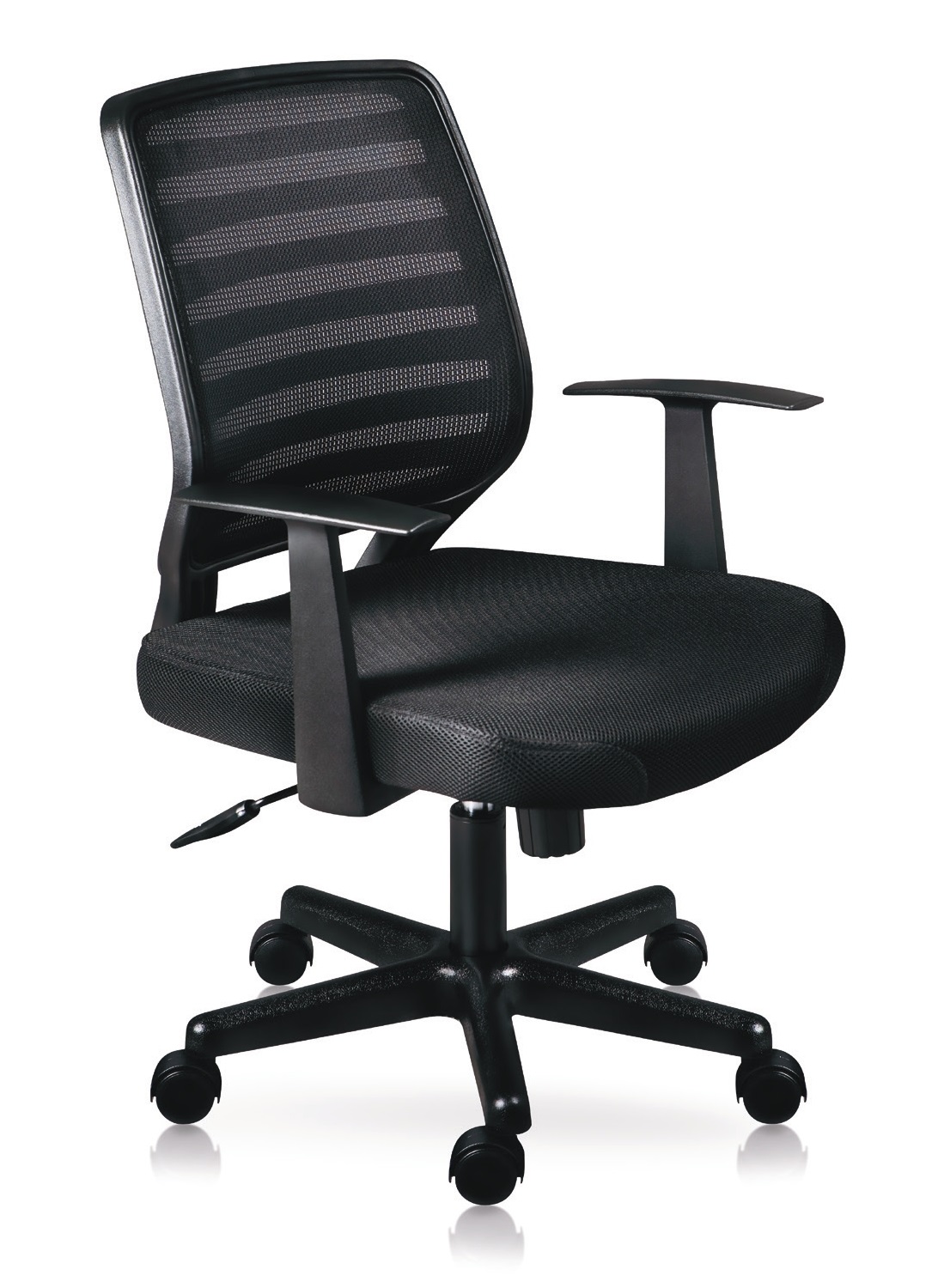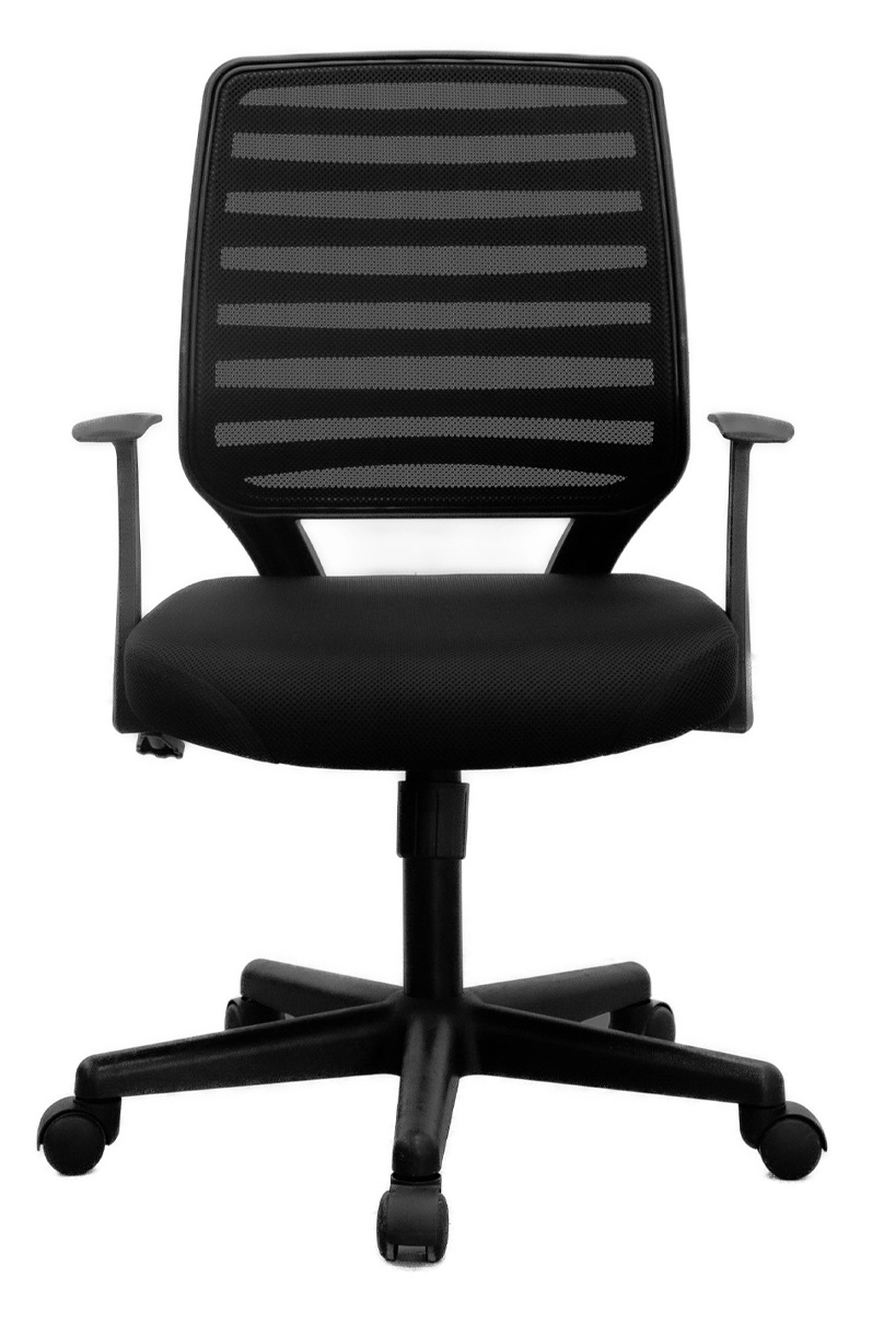 Silla Operativa con Respaldo Tapizado en Malla, Asiento con Espuma de Poliuretano Inyectado Tapizado en Tela, Estructura de Respaldo en Polipropileno Ergonómico con Detalle de Líneas Horizontales, Brazos de Polipropileno en Forma de “T” Fijados al Asiento, Mecanismo Ejecutivo con Palanca para Ajuste de Altura y Bloqueo de Reclinamiento, Perilla Tensora de Reclinamiento y Base de Nylon de 24” con Rodajas.