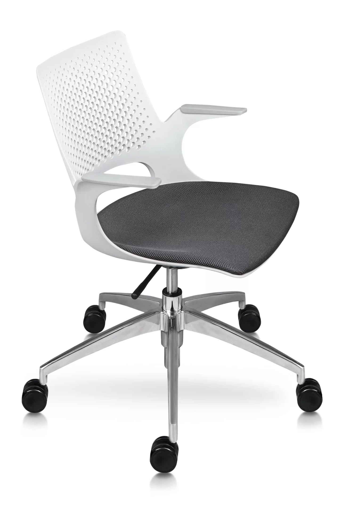 Silla Operativa con Asiento y Respaldo en Una Sola Pieza de Polipropileno Ergonómico Multiperforado Color Blanco, Asiento de Espuma Tapizado en Tela Mesh Color Gris Plomo, Mecanismo con Palanca para Ajuste de Altura y Reclinamiento Sin Bloqueo, Brazos Fijos con Pad de Polipropileno y Base de Aluminio de 26” con Rodajas.