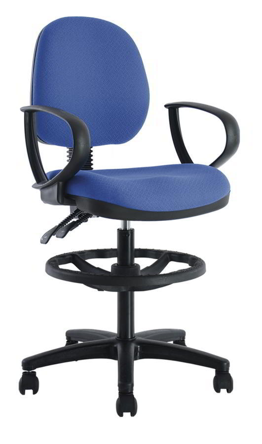 Silla Operativa con Respaldo Bajo y Asiento en Poliuretano Inyectado Tapizados en Tela, Brazos Fijos de Polipropileno, Mecanismo de 2 Palancas para Ajuste de Altura y Bloqueo de Reclinación, Pistón Alto Tipo Banco, Aro Descansapies y Base de Nylon con Rodajas.